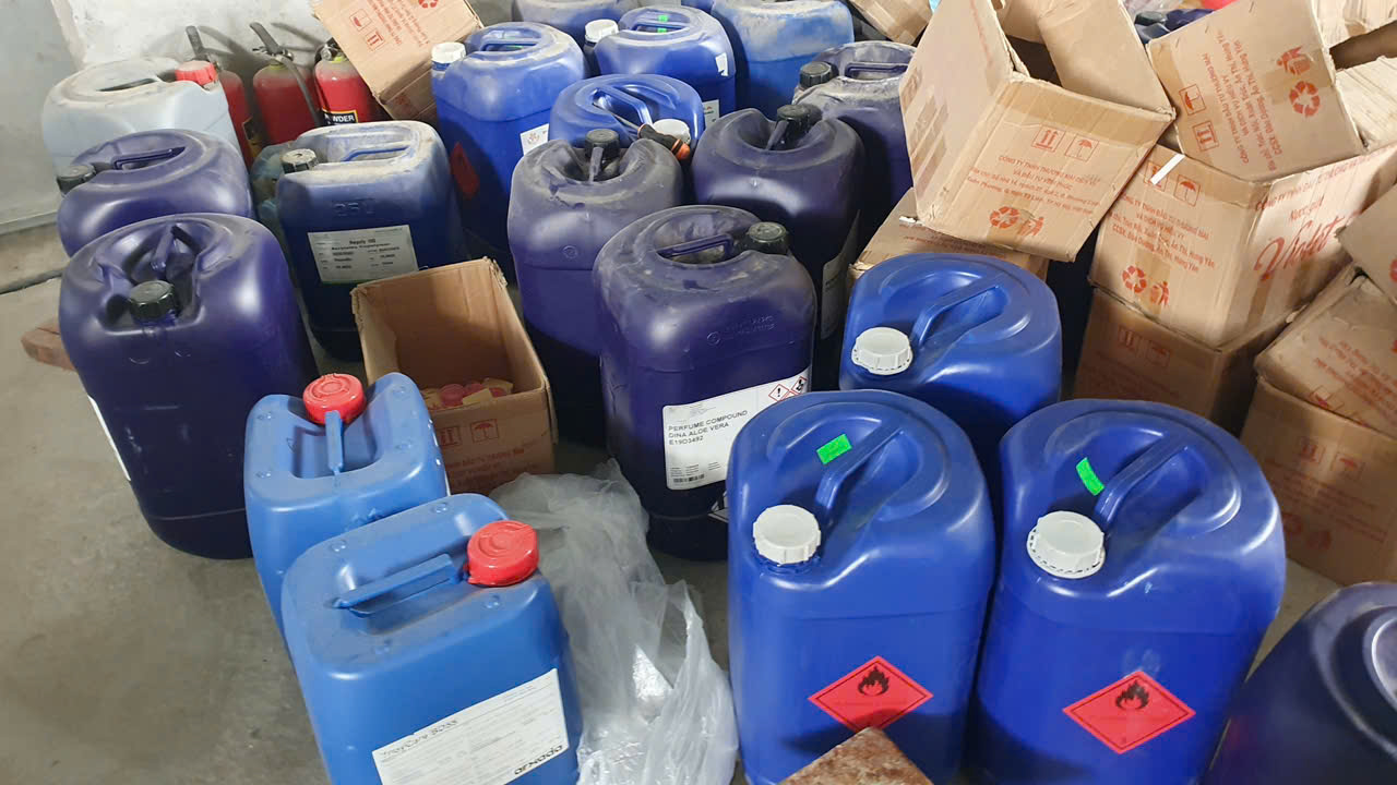 Lượng tang vật thu giữ tại hiện trường rất lớn, gồm hàng trăm can nước rửa chén, nước giặt, nước xả vải cùng hàng ngàn vỏ bao bì, nhãn mác giả nhãn hiệu D-nee, Tauau. Toàn bộ số hàng này được đóng gói, dán tem giả, in thông tin nước ngoài, mã số mã vạch tương tự hàng thật trên thị trường.
