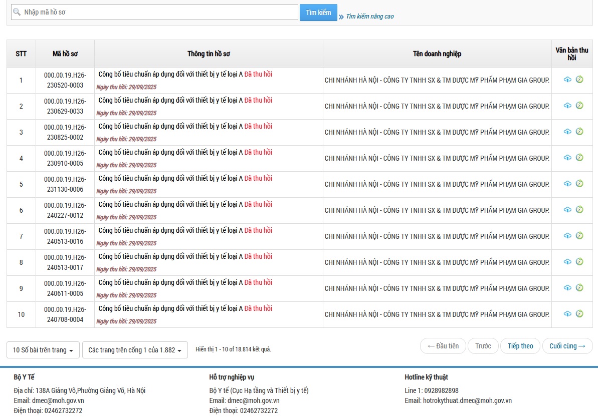 Ngày 29/9, Bộ Y tế đăng thông báo thu hồi Công bố tiêu chuẩn áp dụng đối với thiết bị y tế loại A đối của 10 sản phẩm do Chi nhánh Hà Nội - Công ty TNHH SX & TN Dược Mỹ phẩm Phạm Gia Group, địa chỉ tại Tầng 5, Eurowindow Multicomplex, Số 27 Trần Duy Thành phố Hà Nội công bố và cơ sở sản xuất là Công ty TNHH SX & TM Dược Mỹ phẩm Phạm Gia Group, địa chỉ tại số 1, ngõ 38, phố Đại Liêu, thị trấn Gia Lộc, huyện Gia Lộc, tỉnh Hải Dương (cũ).