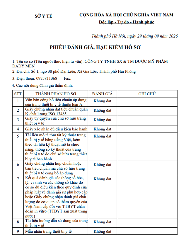 Theo bản công bố phiếu đánh giá, hậu kiểm hồ sơ của Sở Y tế Hà Nội, đơn vị thực hiện tư vấn là Công ty TNHH SX & TM Dược Mỹ phẩm Dady men, địa chỉ tại số 1, ngõ 38 phố Đại Liêu, xã Gia Lộc, Thành phố Hải Phòng.